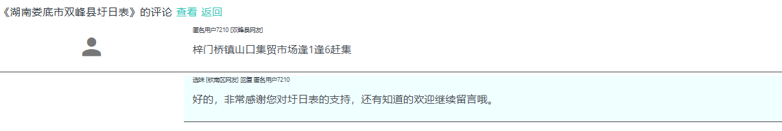 据网友的反馈,新增湖南娄底市娄星区蛇形山镇秋湖村和双峰县梓门桥镇山口集的赶集时间,非常感谢网友的支持...